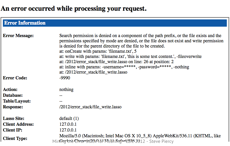 For example, you may be familiar with the article I wrote on file permissions for Lasso 8.[1]  This article came about from my frustration with dealing with file permissions.  It is not a simple matter, and it is very easy to miss a detail that can lay waste to an afternoon of productivity.  It's also easy to misinterpret or not understand the error messages that may be returned.