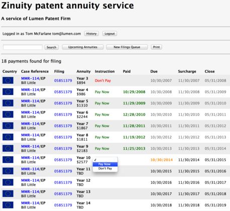 -Results of displaying annuities for a given patent, showing past payment status, and allowing change in instruction for payment of current annuity.