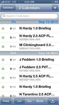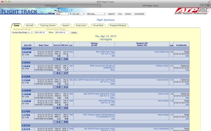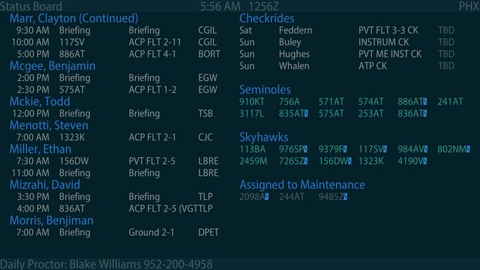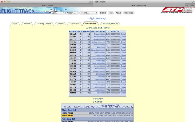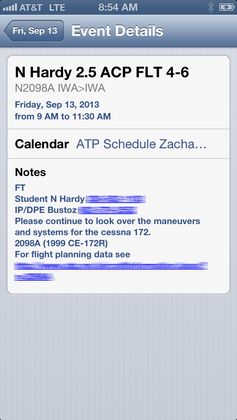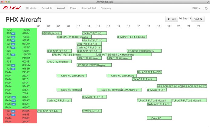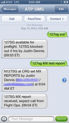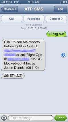 Leading up to the day's flights, instructors and students check their schedules using Lasso-powered iCalendar feeds on their mobile devices. Before preflight inspection, the pilot sends an SMS message to ATP's system to check the maintenance status and block-out the aircraft. The system responds with the maintenance status of the aircraft so that the pilot may make a go/no-go decision. The status report includes any minor issues reported on previous flights. Any major issues will cause the aircraft to report an "Assigned to Maintenance" status and prevent flight in that aircraft. If the aircraft is down, the system recommends alternative aircraft based on similar equipment type and schedule availability. After the maintenance report is acknowledged, the aircraft becomes assigned to the pilot and updates real-time status boards in the training center and flight ops. At the completion of the flight, the pilot blocks-in with aircraft times and any maintenance issues discovered on the flight. This information feeds maintenance, training, and dispatch records and acknowledges receipt by SMS.