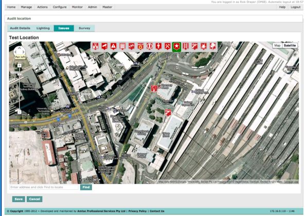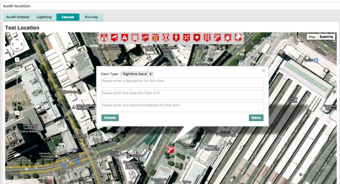 There are three main elements in this application, 1) plotting location based data, 2) generating photo annexes for reports, and 3) adding/prioritising recommendations for reports. This application was specifically designed to work on 3G connected iPads for data plotting, and other workstation based browsers for editing and photo related tasks. The user selects an applicable icon and places it onto a location on the screen (Google Maps with custom overlays option), a dialogue form appears and additional data is entered relating to the plotted point (e.g. security issue, illuminance levels, etc.). The Longitude and latitude of the plotted location, along with data from the form is submitted and stored in a database. Any existing icons show when a geographic area is loaded and the entered data applicable to the location can be viewed/edited by touching (clicking) the icon.