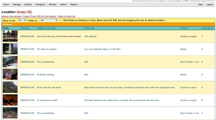 Photos are taken relating to matters plotted on the iPad and are uploaded separately using a simple user interface (including drag and drop multiple photos at a time). Details about the location and subject of the photograph are added/edited inline on the browser. Photos to be including in the report are tagged and stored into the preferred order using drag and drop jQuery techniques coupled with dynamic calls to the Lasso server. Similarly, recommendations are added and cross-referenced to other data and sorted by dragging and dropping on the screen.