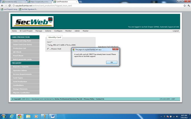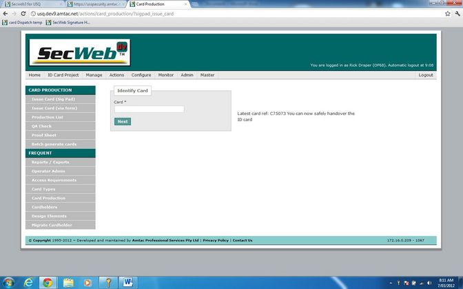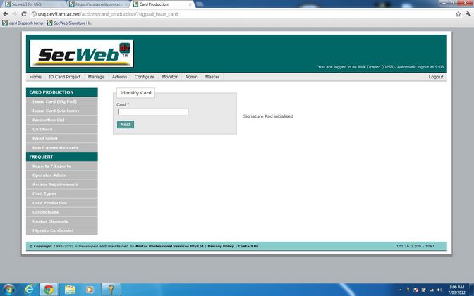 Data from a Contactless Smart Card is scanned into a field on a web form, which when submitted brings up an image of the ID Cardholder in a web page dialogue and triggers a JSONP call to a workstation based web-service that triggers a USB connected digital signature pad. The Cardholder acknowledges the message display on the signature pad LCD and signs for the card. JSONP interaction between the Lasso driven web page and the workstation based web-service presents the signature in the dialogue. The signature is confirmed by clicking the save button on the dialogue and then is submitted in a multipart form for Lasso processing and storage in the applicable database. Viewing details of an issued card shows the signature.