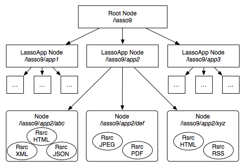 Though LassoApps consist of regular files, those files are logically structured into a tree of nodes and resources. This node tree is constructed to match the file and directory structure inside the LassoApp bundle. Each node is associated with one or more resources. Resources are generally either Lasso pages, CSS, JavaScript, HTML/XML, image or other raw or binary data type.